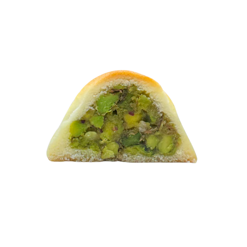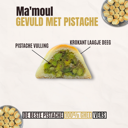 Ervaar de luxe smaak van Ma'moul met pistache, een verfijnd Midden-Oosters koekje met een boterzachte textuur. Gemaakt van bloem en gevuld met een rijke, licht gezoete pistachevulling. Ambachtelijk gevormd en perfect bij koffie of thee!